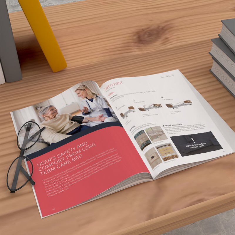 在翻開這本產(chǎn)品宣傳冊設(shè)計的瞬間,仿佛踏入了一個專注于醫(yī)療關(guān)懷的空間。每一頁都精心策劃,以“醫(yī)用床鋪”為核心,展現(xiàn)了不同風格與設(shè)計理念的醫(yī)用家具。從“室內(nèi)設(shè)計”的溫馨雅致,到“工業(yè)風格”的堅實耐用,每一款醫(yī)用床鋪都以其獨特的魅力吸引著我們的目光。紅色調(diào)的巧妙運用,不僅增添了視覺的沖擊力,更寓意著對生命的熱情與尊重,與純白的背景相互映襯,營造出一種既專業(yè)又溫馨的氛圍。