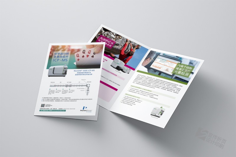 化學材料分析設備宣傳二折頁印刷在進行平面設計的時候,我們常常需要用到三折頁。三折頁是一種設計簡潔而又實用的傳單,它的大小通常是A4紙的三倍。但是,在進行···